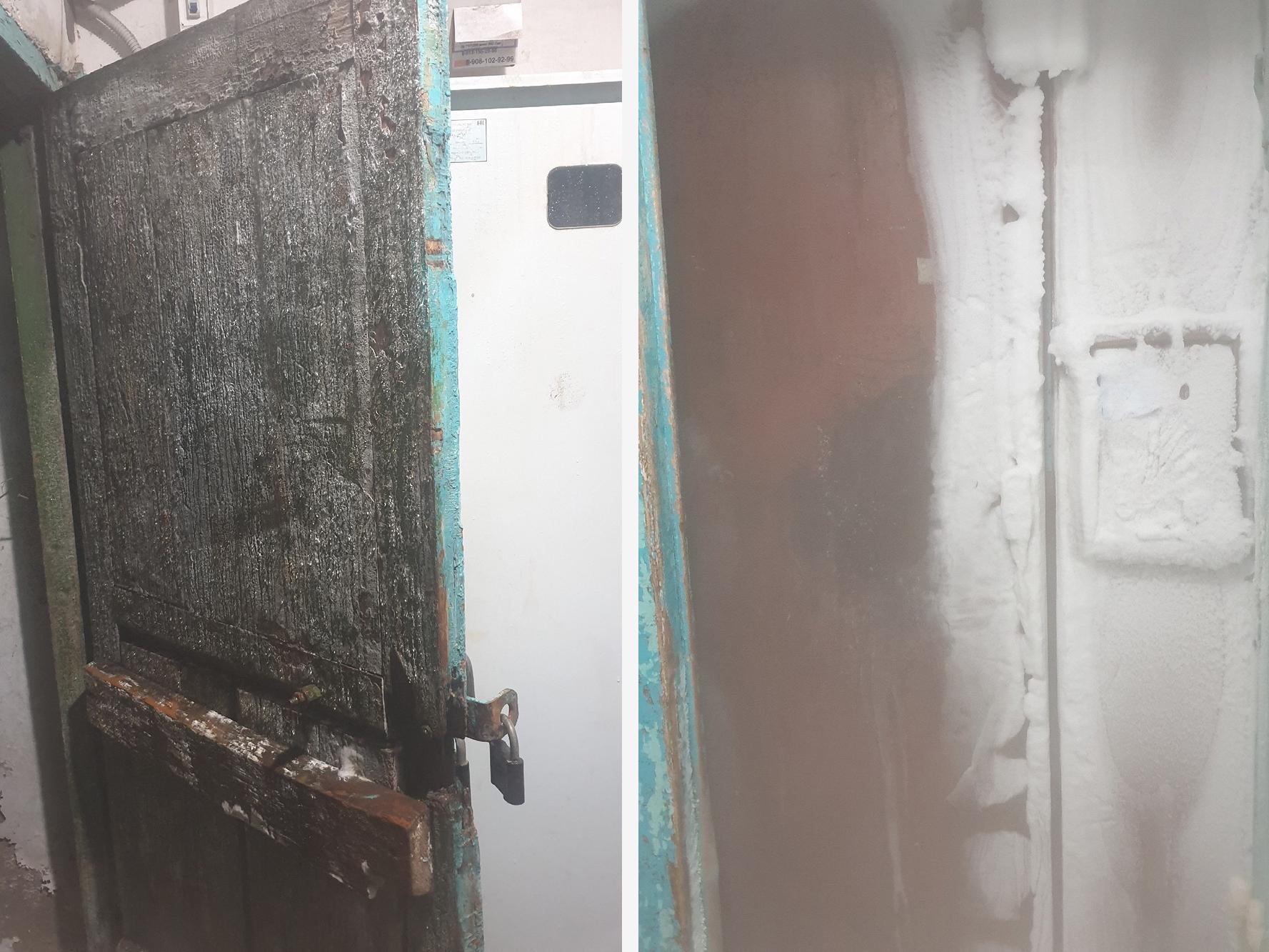 The photograph depicts the water-damaged entrance of the building, covered in mold and moisture.