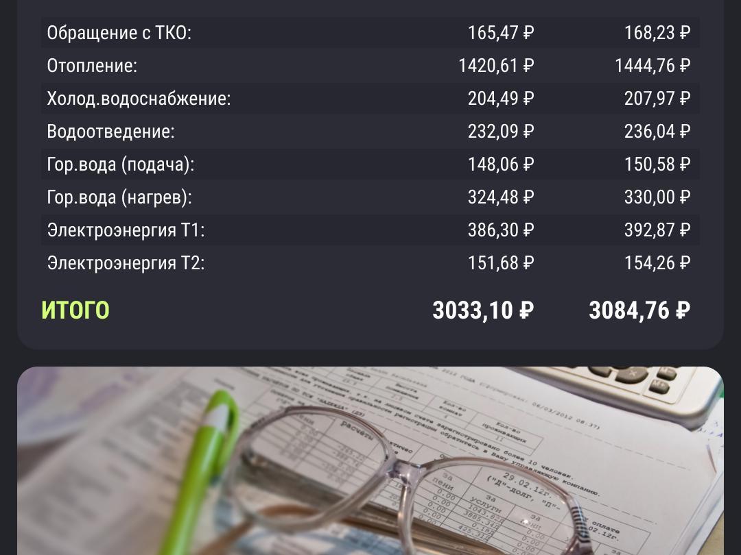 In this specific case, the heating fee will increase by 24 rubles (less than $1), cold water supply — by only 3.48 rubles (less than $1). Hot water supply will become more expensive by 2.52 rubles (less than $1), and heating — by 5.52 rubles (less than $1). Water disposal will also slightly rise in price — by 3.95 rubles (less than $1). Electricity costs (T1 and T2) will increase by 6.57 and 2.58 rubles (both less than $1), respectively. The amount in the «Waste Management» line will also become a bit higher — our reader will pay 2.76 rubles (less than $1) more than usual.