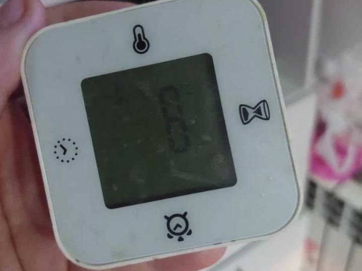 An indoor thermometer registers a mere +8°C (46°F) amid the prolonged heating outage.
