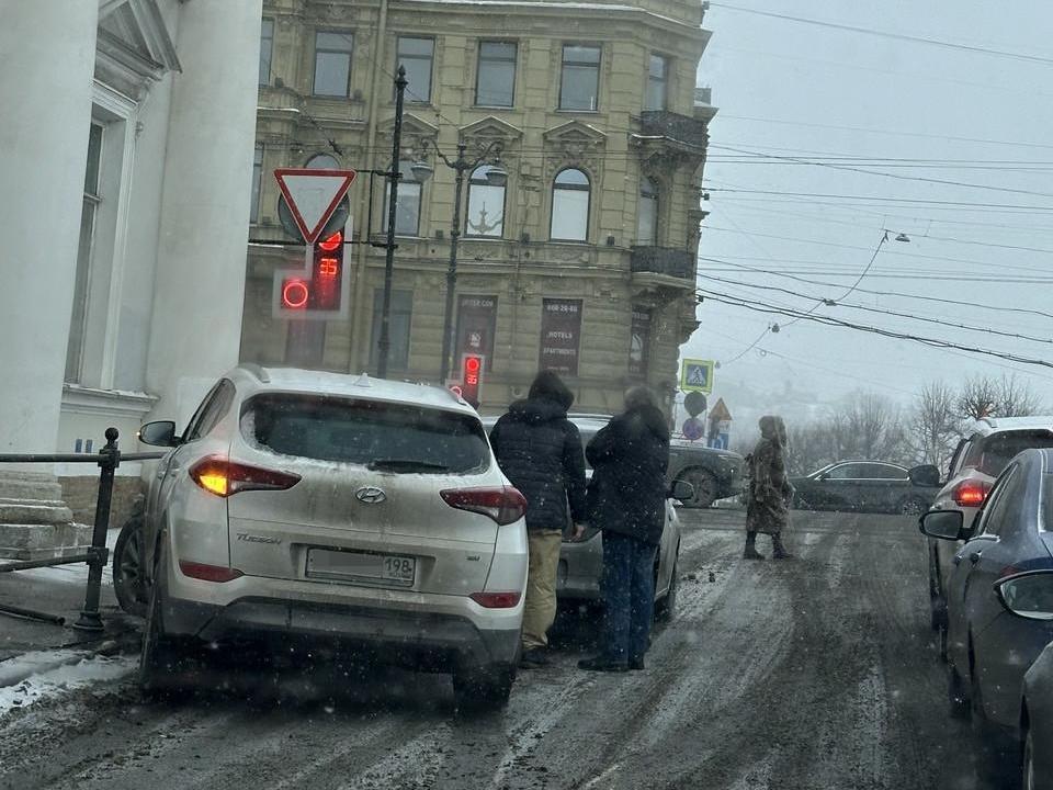 On the afternoon of February 2, a traffic accident occurred at the intersection of Nevsky Prospekt and the Fontanka Embankment in central St. Petersburg. The crash blocked the right-turn lane and caused a traffic jam.
