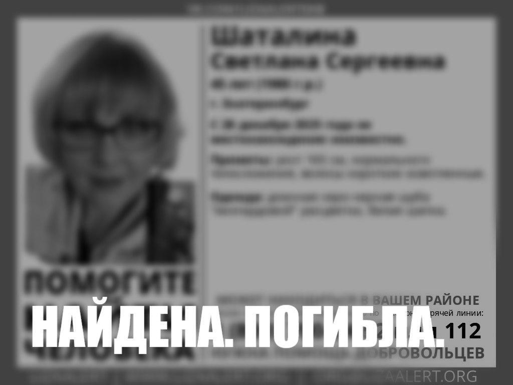 The body of 45-year-old Svetlana Shatalina from Serov was found in Yekaterinburg. On January 16, the search was called off, and it was later reported that the woman had died.