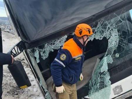 The accident occurred in the area of the Semigorsky hamlet. After the impact, the bus left the roadway and ended up in a ditch. There were 22 passengers and the driver inside — all of them were trapped.