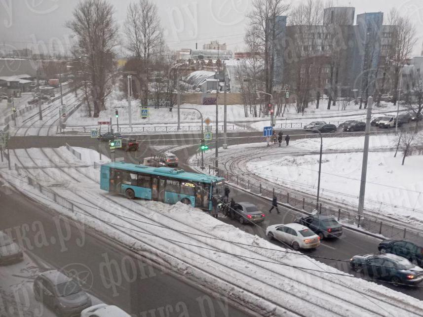 On January 27, a bus slid onto tram tracks at the intersection of Revolution Highway and Potapov Street in St. Petersburg. Tram traffic is blocked, causing a traffic jam.