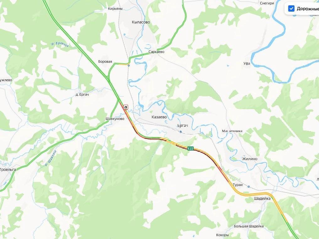 At 13:04, a mark indicating a traffic accident appeared on Yandex«s online map in the area of Shavkunovo village in Kungursky District. From this settlement to Shadeyka, a 10-kilometer traffic jam has stretched. Traffic is also difficult on lanes leading from Kungur to Perm, i.e., in the opposite direction.