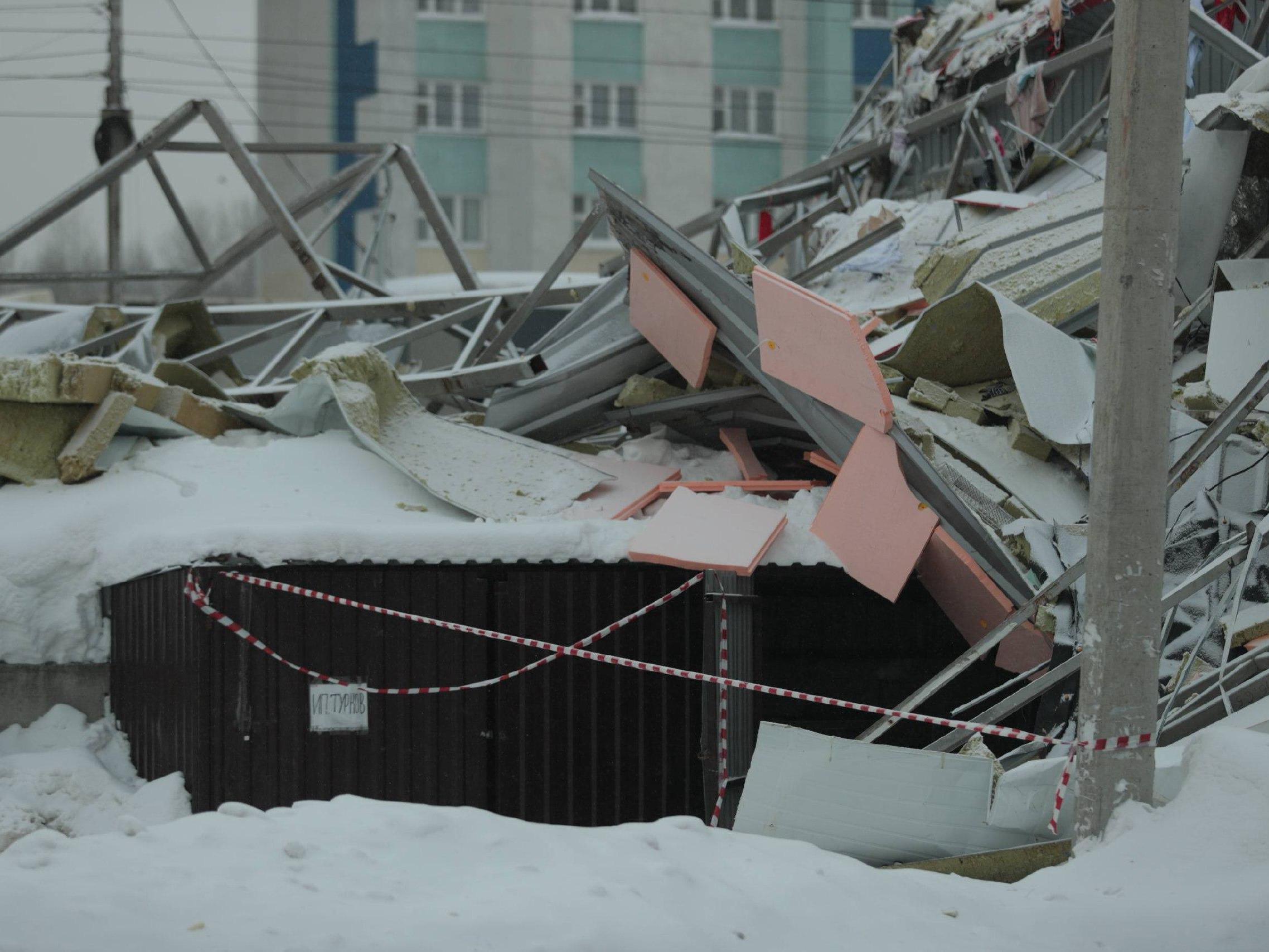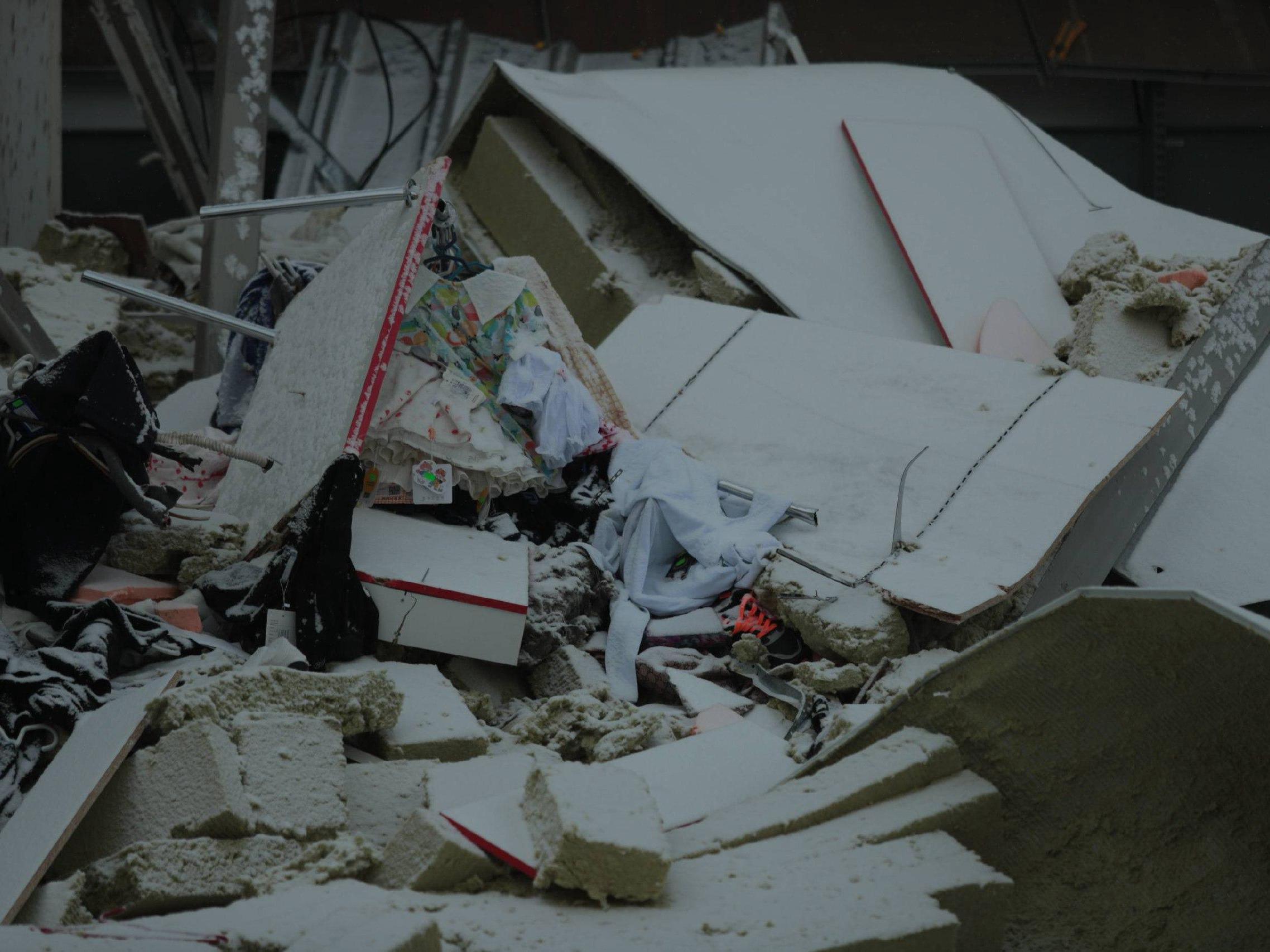The debris from the collapsed structures remains on site at the shopping center.