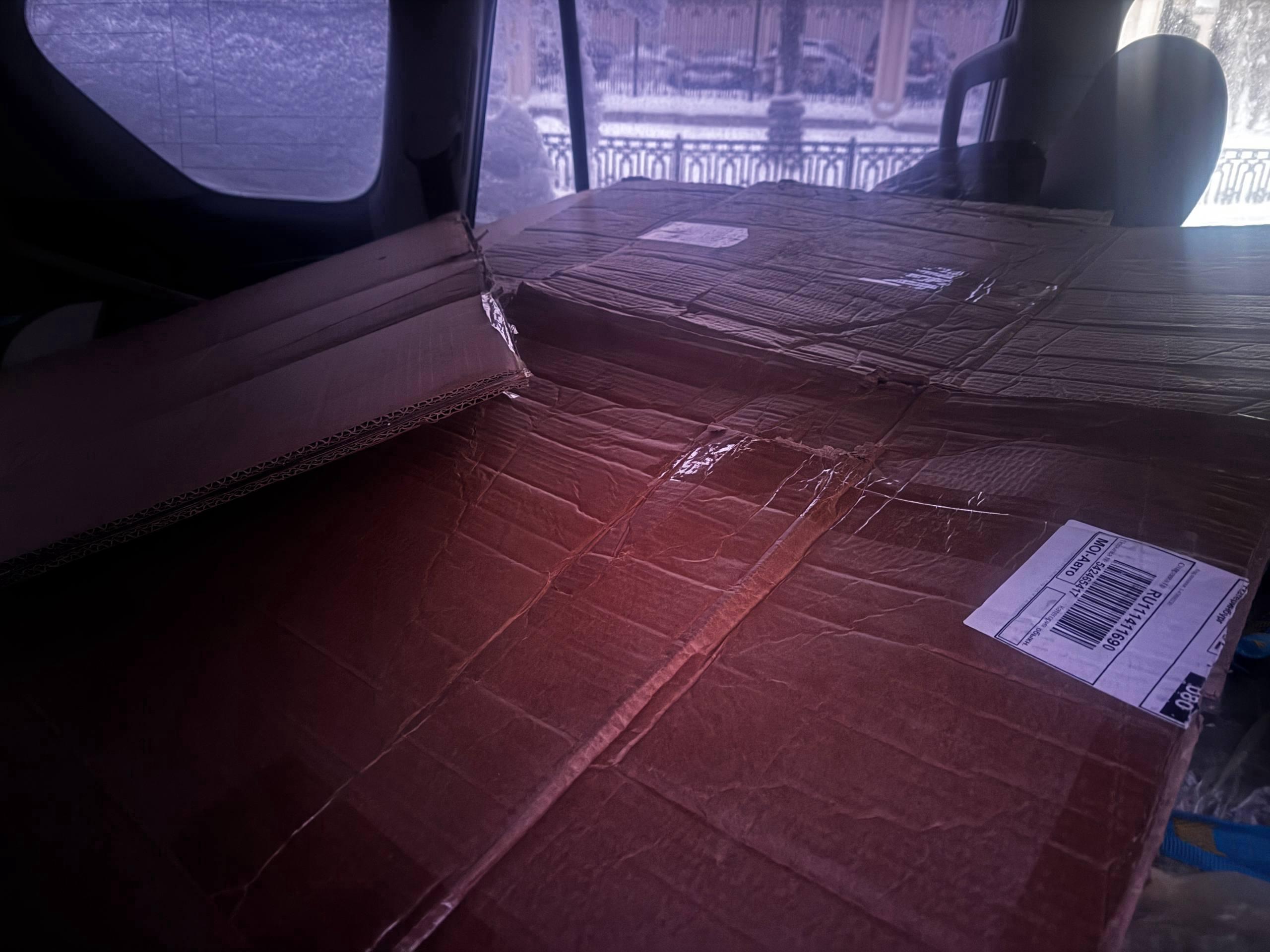 The SUV shows no visible damage. During its stay, it has been dusted with snow, but the side window was cleared — possibly by passersby checking to see if the driver was inside. The cabin is filled with boxes and bags.