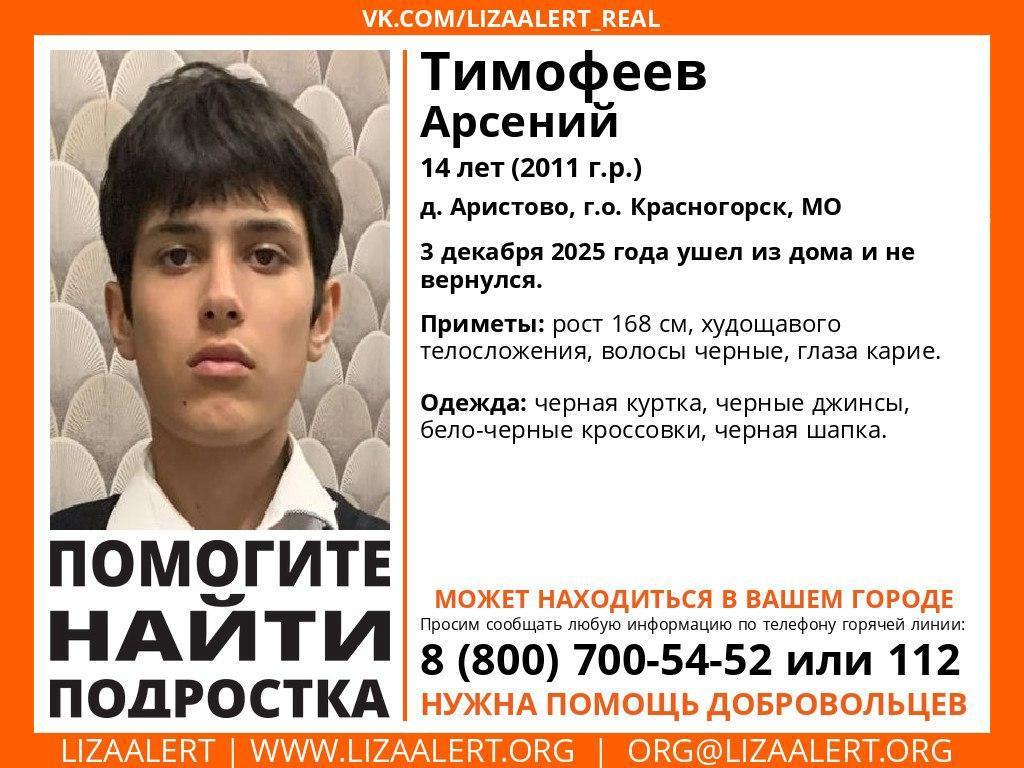 Arseny Timofeyev, 14, from the village of Aristovo in the Krasnogorsk urban district, left home on December 3 and disappeared. Two days later, he showed up at school for lunch, dusty and dirty, and has not been heard from since. According to the Liza Alert search and rescue team, which spoke with MSK1.RU, the boy is actively moving around Moscow Oblast by commuter train: he is in one area one hour, and in another the next.
