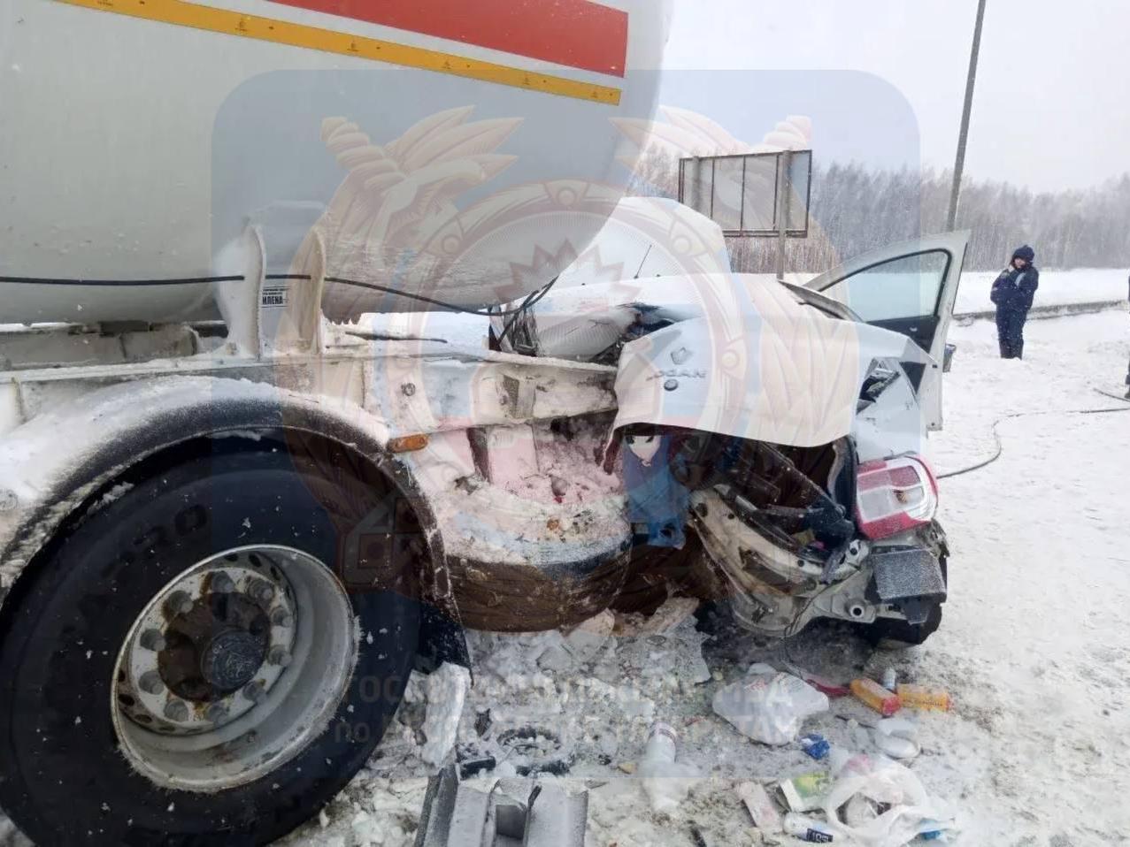 Preliminary details of the accident are as follows. The 31-year-old driver of a Renault car, as established by law enforcement, did not choose a safe speed and distance on the snowy highway. As a result, he crashed at full speed into a parked semi-trailer of a fuel truck. Its driver had stopped to clear the vehicle of snow.