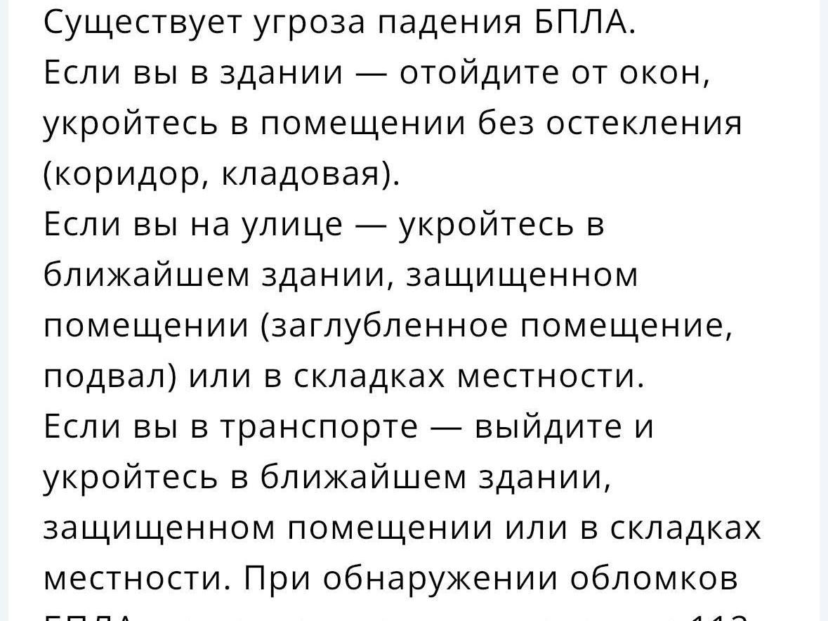 “There is a threat of a UAV crash. If you are in a building — move away from windows, take shelter in a room without glass (a corridor, a pantry),” the message stated.