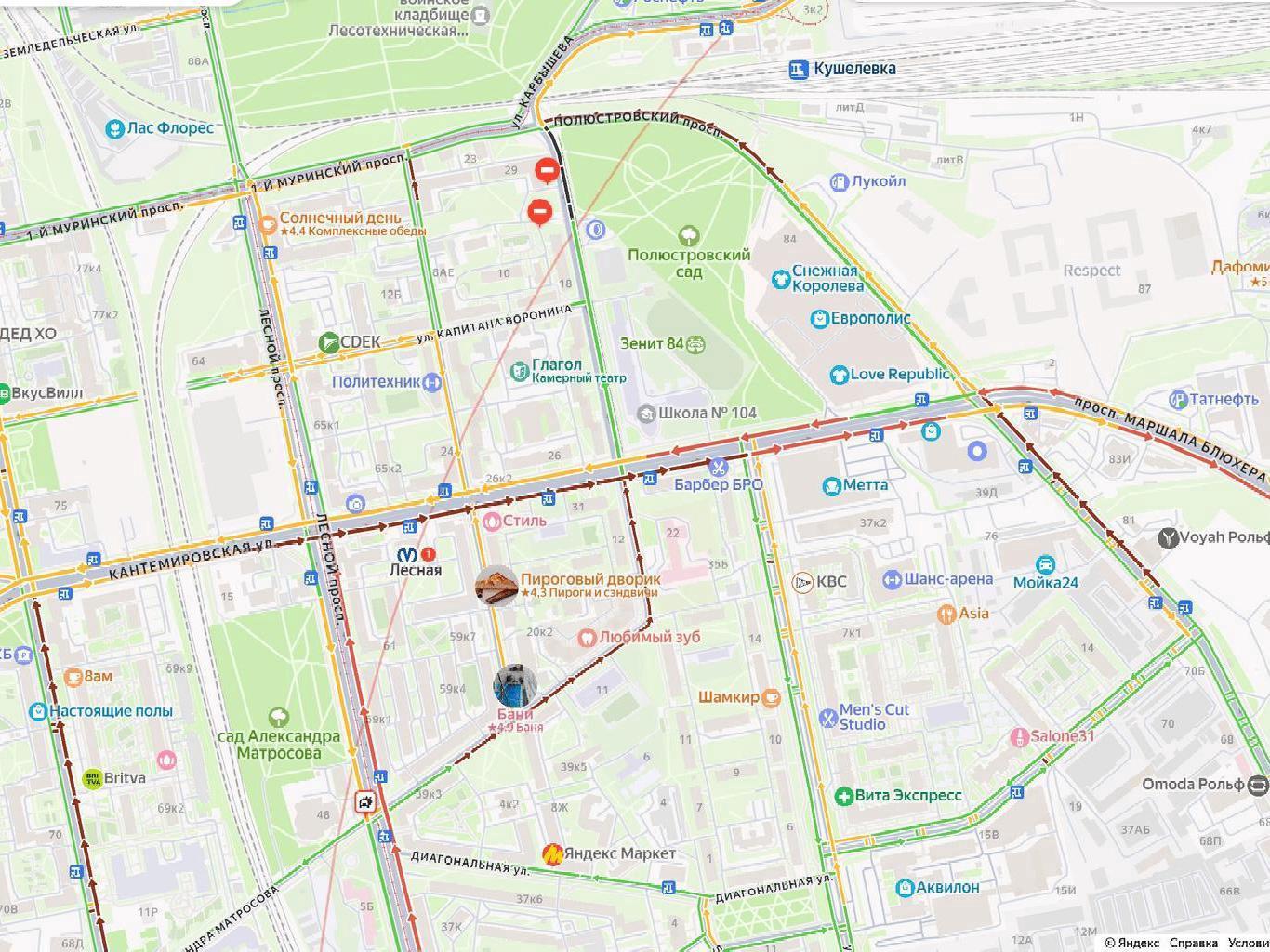 A map from Yandex Maps shows the traffic jam stretching nearly two kilometers from the fire.