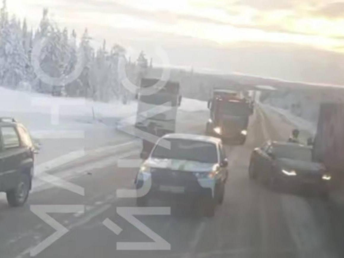 Video footage captures a multi-vehicle collision blocking a road in Murmansk Oblast with no injuries.