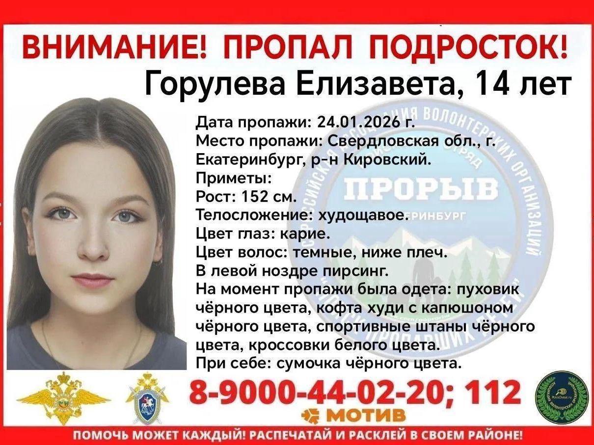 In Yekaterinburg, a search is underway for 14-year-old Lisa Goruleva, a gymnasium student who went to a friend«s house for the night on January 24 and did not arrive at the designated location.