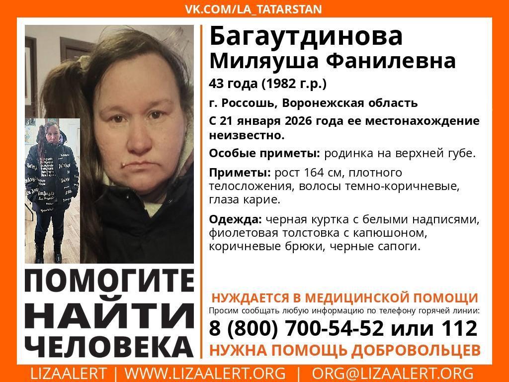 Additionally, volunteers are currently searching for Milyausha Fanilevna Bagautdinova, who disappeared on January 21 in Rossosh. The 43-year-old woman requires medical assistance. On the day she vanished, she was wearing a black jacket with white lettering, a purple hooded sweatshirt, brown trousers, and black boots. Milyausha is of average height (164 cm, or 5 ft 4.5 in), of stocky build, with brown eyes and dark brown hair. A distinguishing feature is a mole on her upper lip.