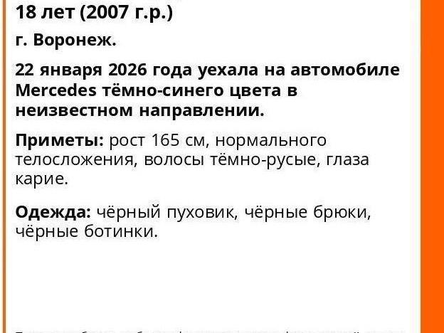 The search for 18-year-old Aleksandra Yevgenyevna Lalachkina is being conducted by volunteers from the Voronezh unit of the search and rescue organization LizaAlert. According to the volunteers, the girl was last seen on January 22 when she drove away in a dark blue Mercedes to an unknown destination. Sasha was wearing black trousers, a black down jacket, and black boots. She is of average height (165 cm, or 5 ft 5 in), of normal build, with brown eyes and dark blond hair. The young woman comes from a two-parent family and is an active athlete: she has been a prize-winner in sambo competitions multiple times. Anyone who has seen Aleksandra or has information on her whereabouts is asked to call 112 or the LizaAlert hotline at +7-800-700-54-52 (available 24/7, free from anywhere in Russia).