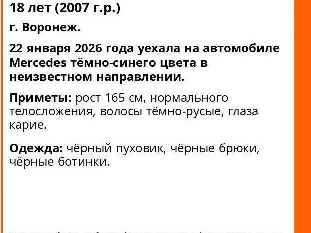 The Voronezh volunteer squad LizaAlert shared details of the search for 18-year-old Alexandra Yevgenyevna Lalachkina. Recall that the girl is an athlete who practices sambo and went missing on January 22. She was last seen when she drove away in her dark blue Mercedes.
