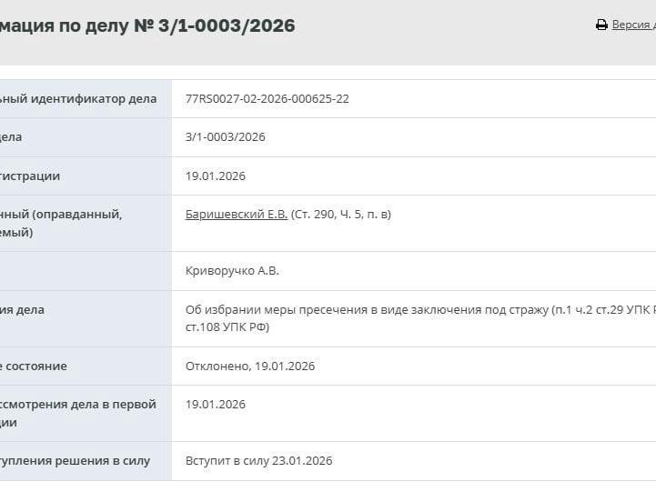According to media reports, the man was detained on 16 January. A criminal case has been opened against Barishevsky under Part 5, Clause «c» of Article 290 of the Russian Criminal Code (receiving a bribe on a large scale). If found guilty, the official faces up to 12 years in prison. The case is being considered by the Tver District Court of Moscow.