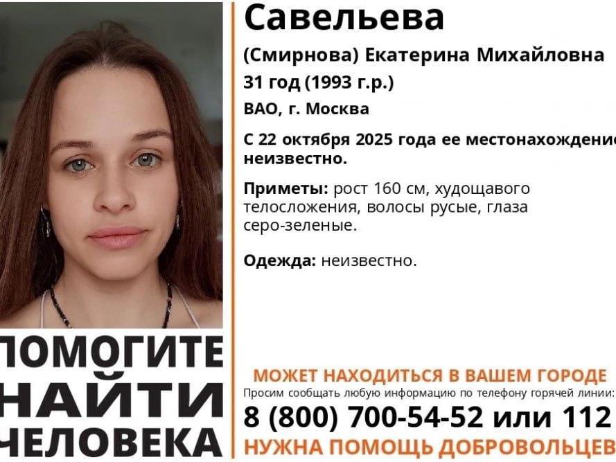 If you have any information about the whereabouts of Yekaterina Mikhailovna Savelyeva (Smirnova), born 1993, please report to the hotline: 8 (800) 700-54-52 or 112.