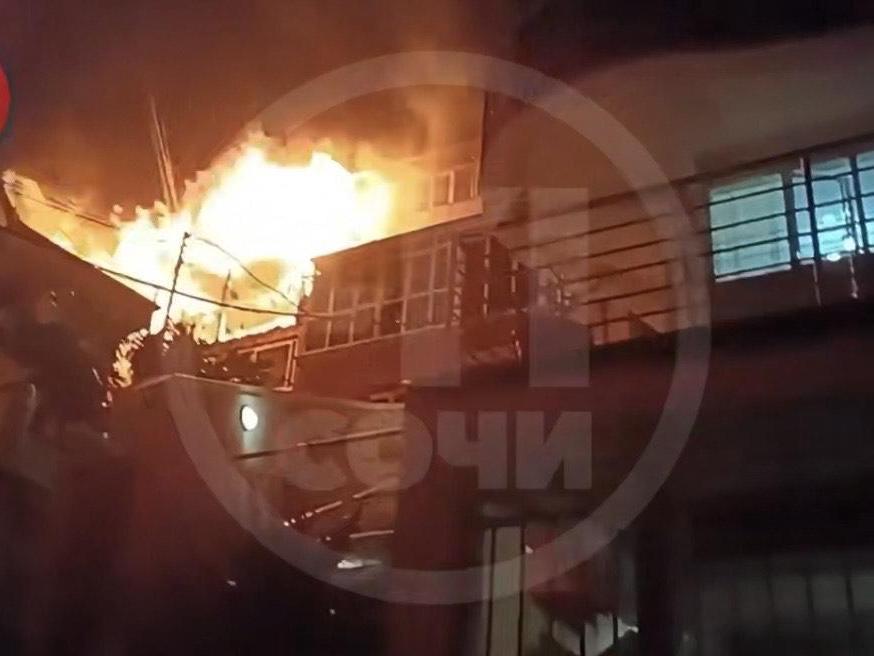 In central Sochi on Pervomayskaya Street, a private house caught fire. The press service of the Main Directorate of the Russian Ministry of Emergency Situations (EMERCOM) for Krasnodar Krai reported that a fire call was received by the dispatcher of the Sochi Fire and Rescue Garrison at 20:41. Footage shows the building completely engulfed in flames in a densely built-up area, with apartment buildings in immediate proximity.