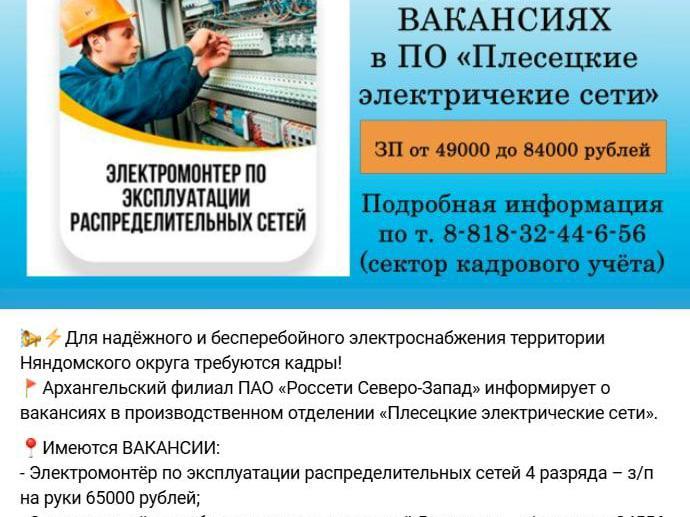 The official community of the Nyandoma District on VK posted information on January 27 about the search for electricians.
