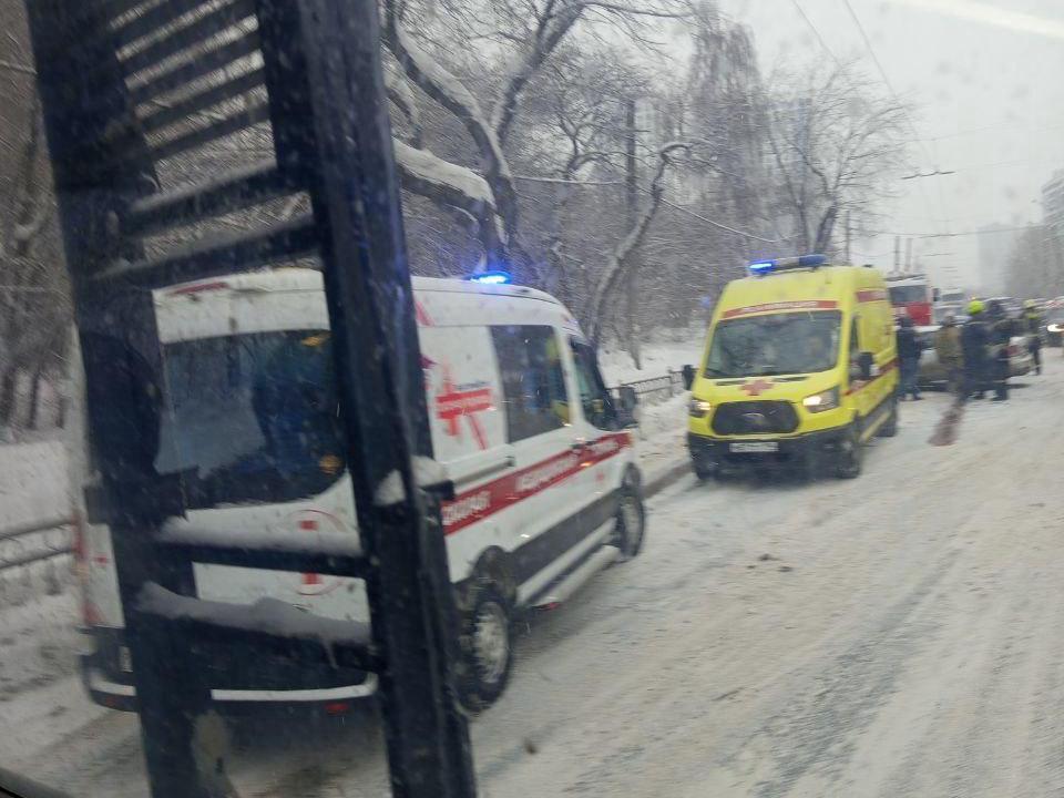 Near the «Ulitsa Proninoy» stop towards Khimmash, there is a serious accident involving three cars, with two ambulance teams and one fire brigade team on site.