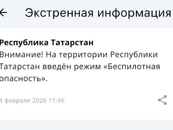 Tatarstan declared a drone danger alert for the first time in February, with the Ministry of Emergency Situations sending a notification at 11:46.