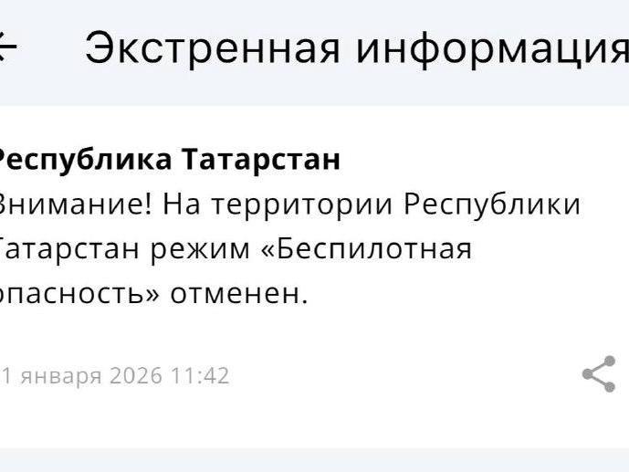 The unmanned danger regime in Tatarstan was canceled after almost three hours, with the Ministry of Emergency Situations notifying residents at 11:42.