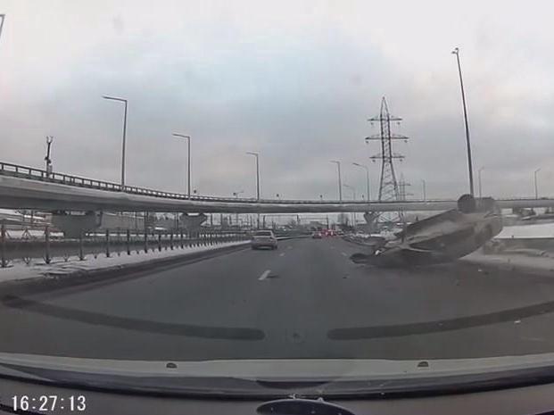 On 28 January, a taxi flipped onto its roof after hitting a road barrier on Vitеbsky Avenue in St. Petersburg's Moskovsky District. A dashcam recorded the incident.