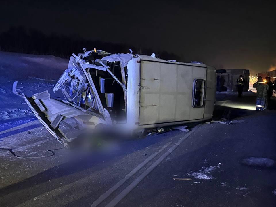 At the 965th kilometer of the highway, an Iveco truck was carrying a modular house toward Krasnoyarsk. The trailer detached, flew into the oncoming lane, and crashed into a Gazelle minibus. There were 14 people in the cabin: a 52-year-old driver and 13 passengers.