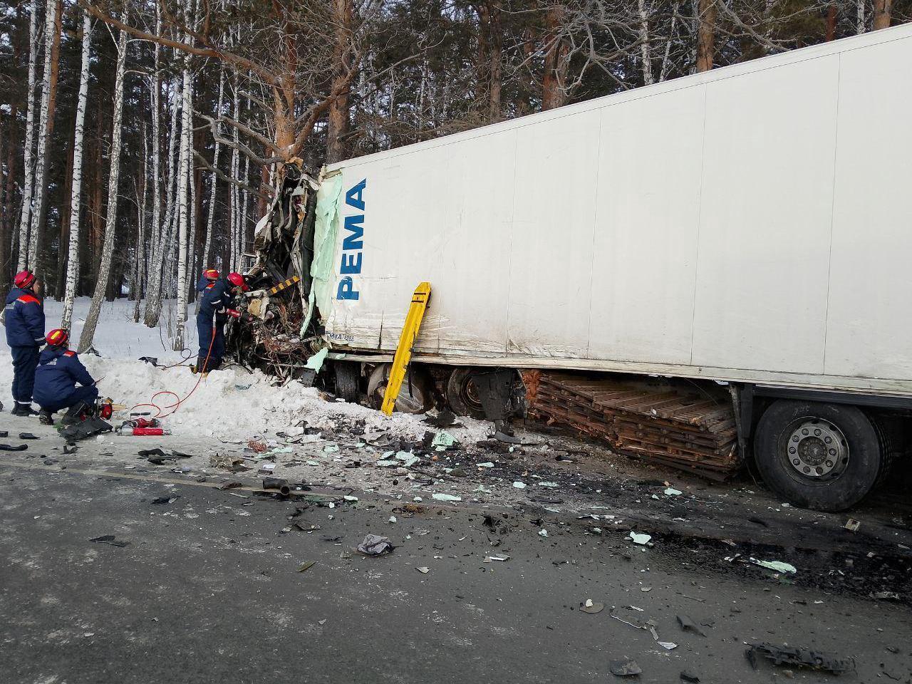 The Traffic Police of Tyumen Region commented: «After that, there was a head-on collision with a GAZelle Next van. The Volvo truck then went off the road into a ditch and hit a tree. The driver was trapped in the crumpled cabin, and rescuers are trying to save him.»