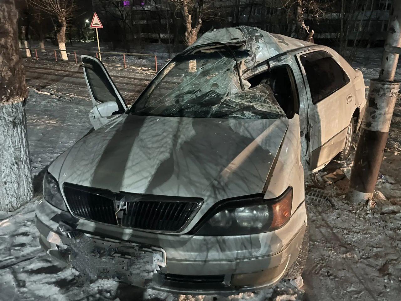 According to preliminary data, on the night of 31 January on Tsentralnaya Street near house No. 626, an underage driver without a license, driving a Toyota Vista, lost control, left the roadway, and crashed into a metal lighting pole.