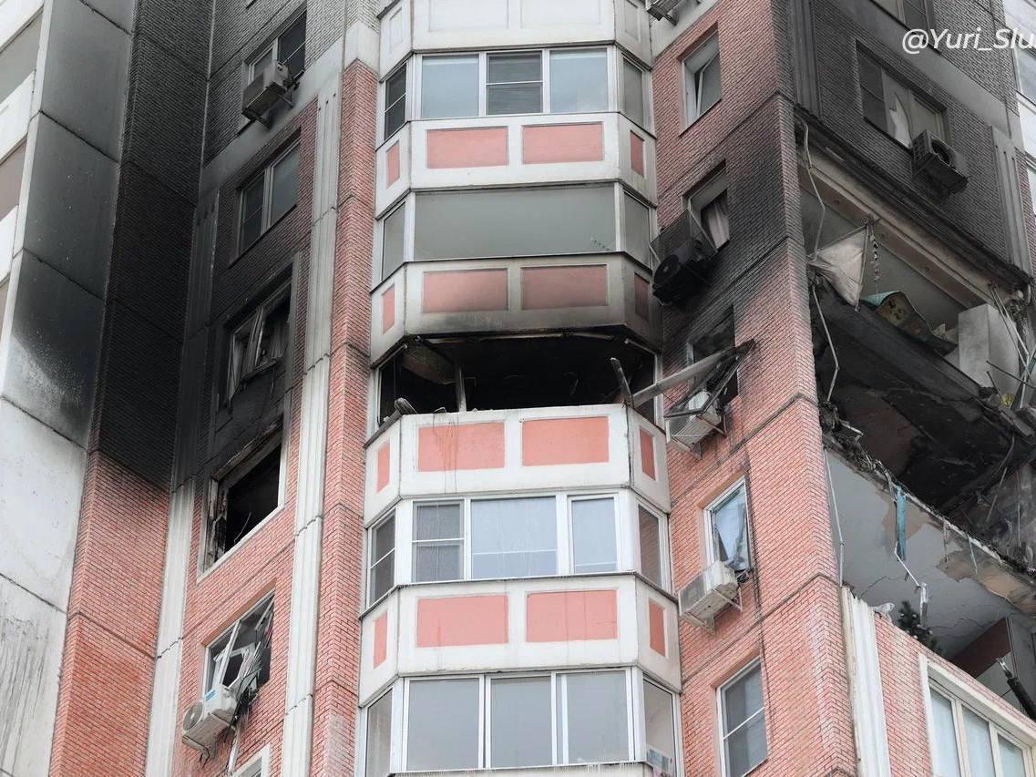 The entrance of the high-rise building that was hit by the drone is seriously damaged. Initially, authorities said it could collapse. But later experts determined that it can be preserved. Residents cannot return yet.