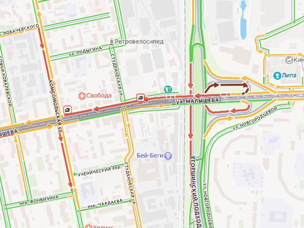 «Malysheva at Komsomolskaya is blocked. Two trucks, a bus, and four cars collided. Although the bus and trucks probably just can»t get through and are stopped with their hazards on,« an eyewitness reported.