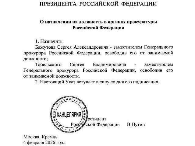 Vladimir Putin signed a decree appointing Sergey Bazhutov and Sergey Tabelsky as deputy prosecutors general of the Russian Federation.