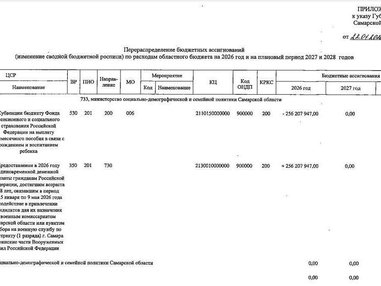 «The one-time payment for those who, from January 25 to May 9, 2026, facilitate the arrival of a candidate at a military commissariat or assembly point for signing a contract (1st category), will amount to 114,943 rubles (approximately $1,150 at current rates). This amount will be paid to adult citizens for each recruited contract soldier,» according to Decree No. 16-u «On Establishing a Separate Expenditure Obligation of Samara Region and Reallocating Budget Appropriations (Amending the Consolidated Budget Schedule) of the Regional Budget.»