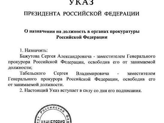 Sergey Bazhutov, former prosecutor of the Komi Republic, and Sergey Tabelsky, prosecutor of Krasnodar Krai, have been appointed deputy prosecutors general of Russia. The corresponding decree signed by President Vladimir Putin has been published on the government«s legal information website.