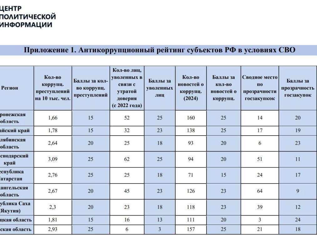 A study by the Center for Political Information evaluated Russian regions on metrics including government procurement transparency, official dismissals, and uncovered corruption cases.