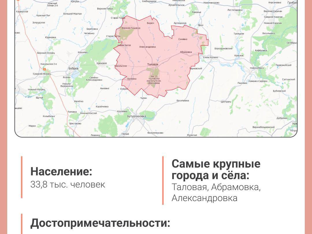 Talovsky District is located in the southeastern part of Voronezh Region. With an area of 1,910 sq. km, it ranks among the ten largest districts in the region. In terms of population, it is not a leader: in 2025, 33,829 people lived there. A third of them—10,815 people—live in the district center, the working settlement of Talovaya.