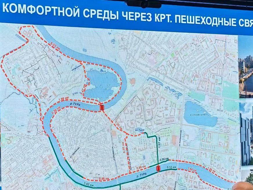 «The total length of the paths will be over 28 kilometers. It is planned that there will be pedestrian routes running through the DOK, the Zareka area, and along the Tura River embankment, totaling almost 20 kilometers. Also planned are two bridges — from Zareka to the DOK in the Shcherbakova area and from Rechport to the Zareka area,» as indicated on the map published by city administration representatives.