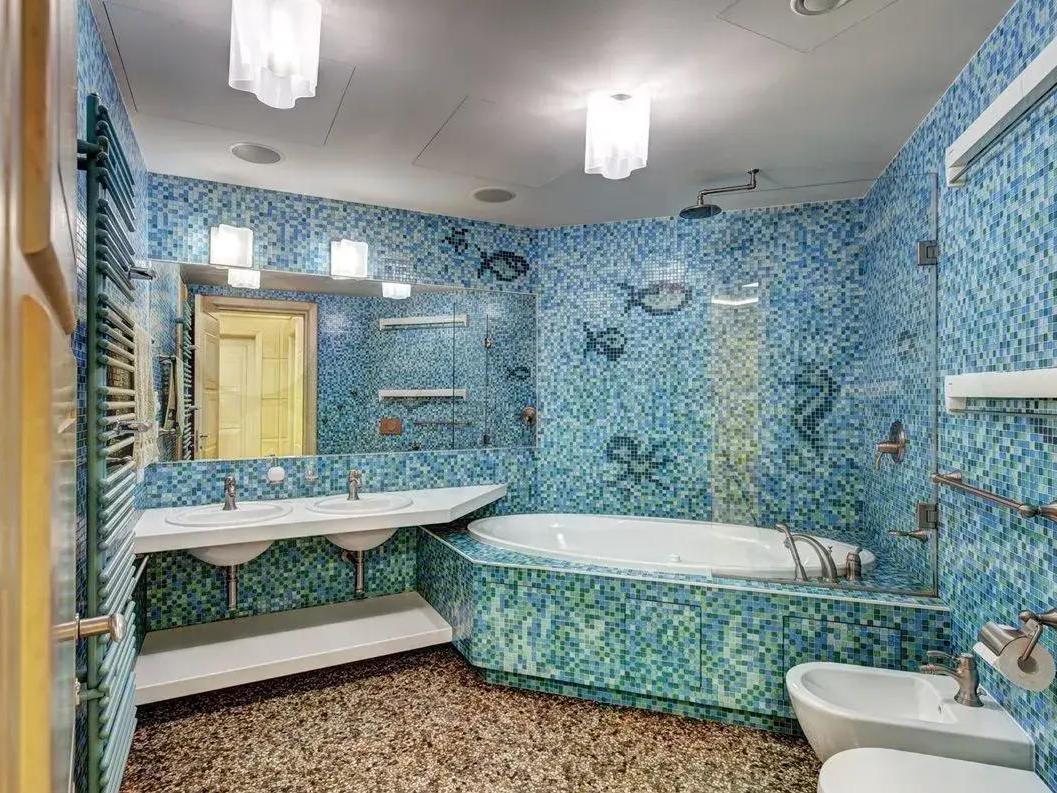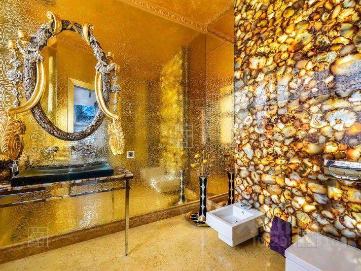 The apartment has designer renovation, vaguely reminiscent of the early 2000s, a wall-sized TV in the living room, a fireplace, a bathroom with a large window, a Jacuzzi, several bathrooms, and other luxury attributes.