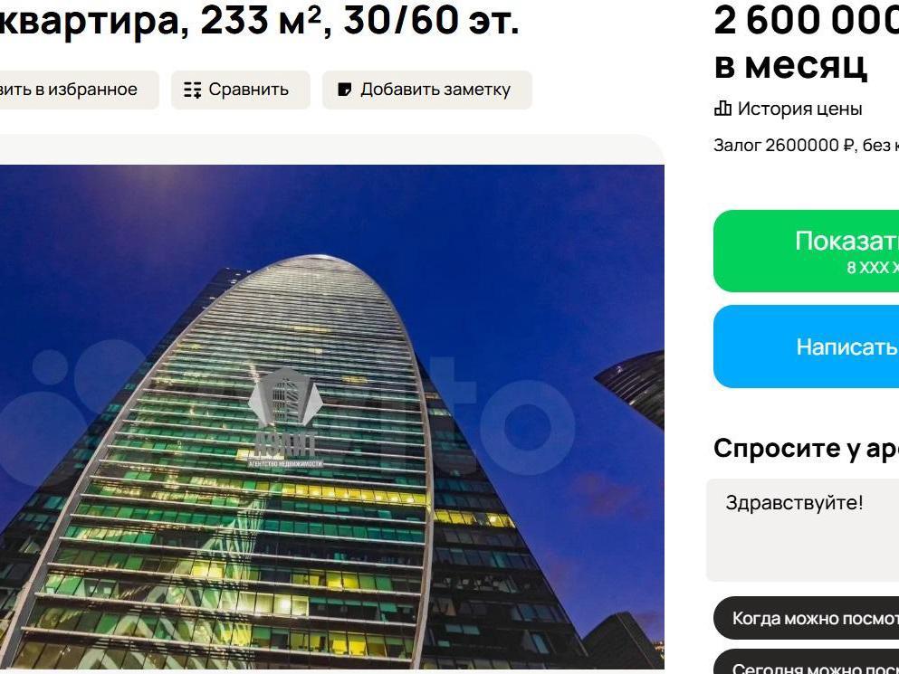 It«s true that prices in the famous skyscrapers have soared. A two-room apartment in one of the Moscow City towers is rented for 2.6 million rubles (around $26,000) per month. The apartment»s area is not small—233 square meters (2,508 square feet). You won«t be able to examine the interiors in detail—the listing has only two (!) photos, although its authors warn in caps: »Not a fake!«