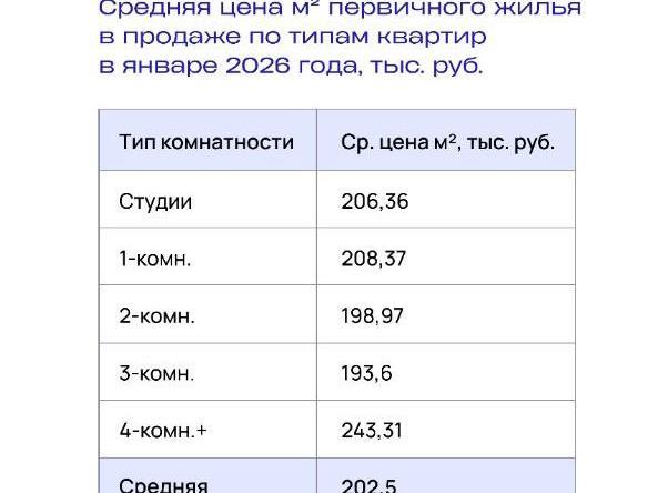 This figure is derived from recalculating the cost per square meter in different types of primary housing. In studios, it was 206.36 thousand rubles (approximately $2,300), in one-bedroom apartments — 208.37 thousand (approximately $2,315), in two-bedroom — 198.97 thousand (approximately $2,210), in three-bedroom — 193.6 thousand (approximately $2,150), and in four-bedroom — 243.31 thousand rubles (approximately $2,700).