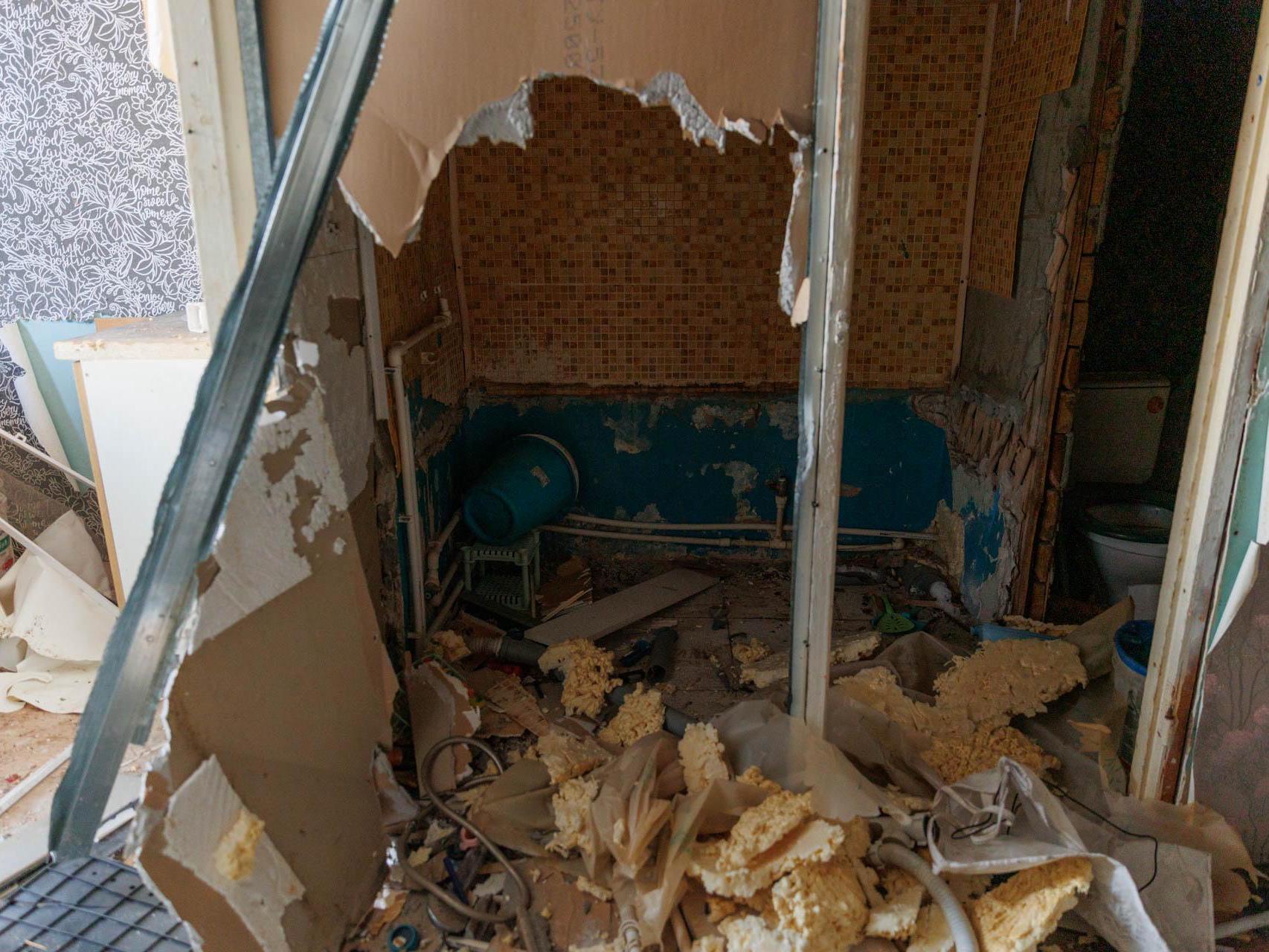 The bathroom is now a wreck. Looters smashed the drywall wall and removed almost all the plumbing from the toilet. From the kitchen, they took all the appliances, even cut off the radiators.