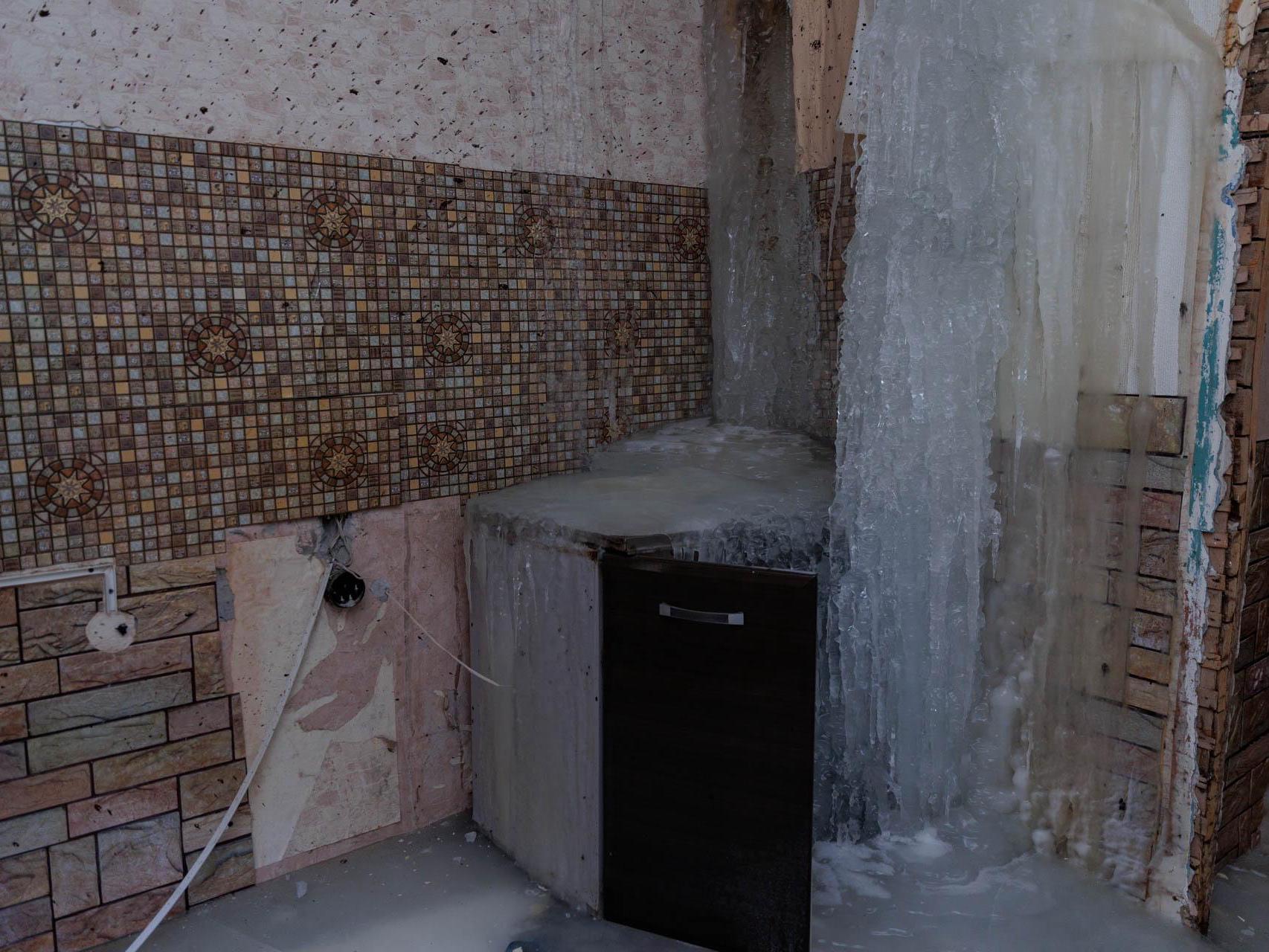 And indeed, the apartment on the first floor shows the consequences of the flood. In the small kitchen — a huge cold column, the floor is slippery. In some places, frost has formed intricate patterns.