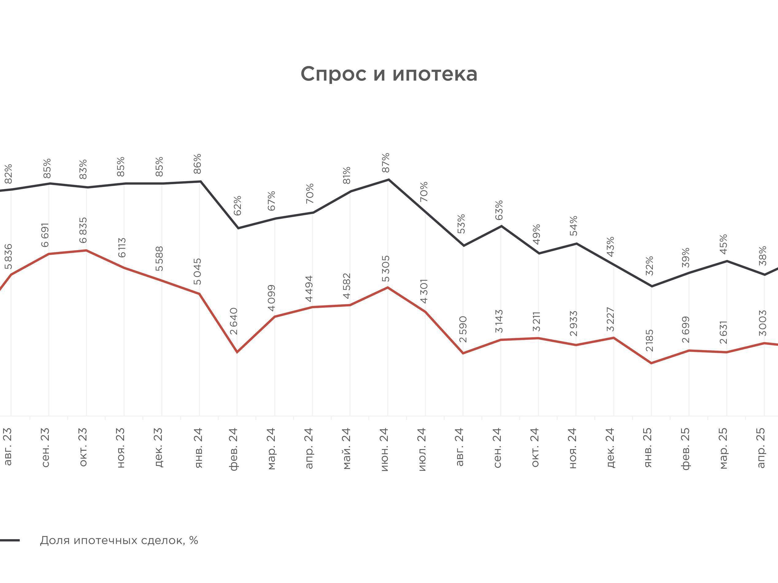 The correlation between demand and mortgages has significantly strengthened. In 2023, the share of mortgage deals stayed at 80-86%, while the number of deals fluctuated from 2.6 to 6.8 thousand per month; the correlation coefficient was 0.47, indicating a moderately weak link. From February 2024 through the end of 2025, the curves for demand and mortgage issuances nearly coincided, and the correlation coefficient rose to 0.83, signaling a very strong dependency. According to GC PSC, the family mortgage accounted for 85-90% of all mortgage deals during this period.