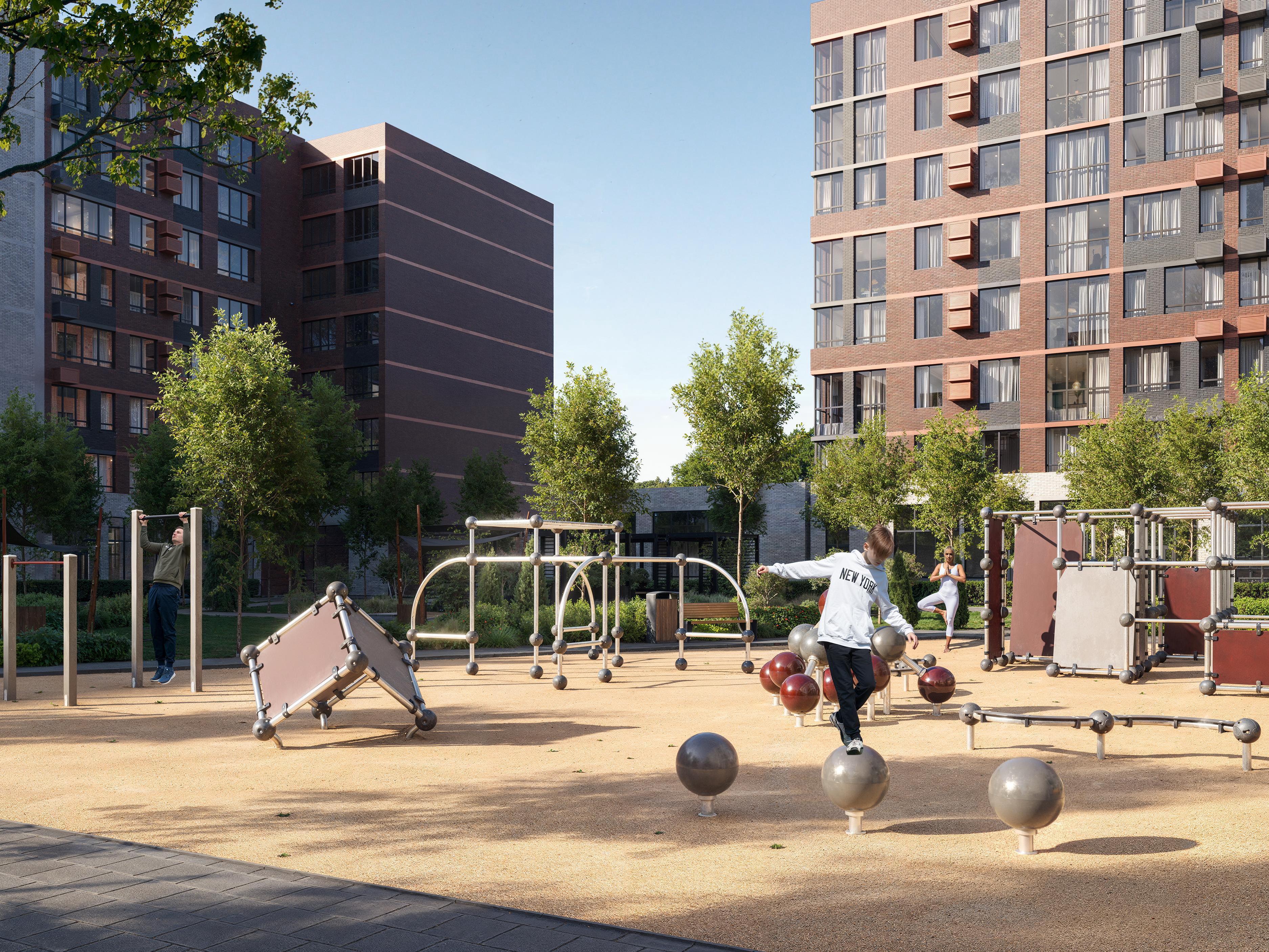 The center of attraction will be its own fitness and wellness complex with gyms, space for group classes, and a pool. For outdoor sports enthusiasts, the project includes bike paths and various sports courts in the courtyards.