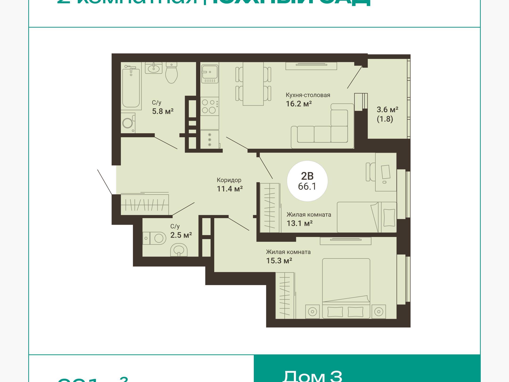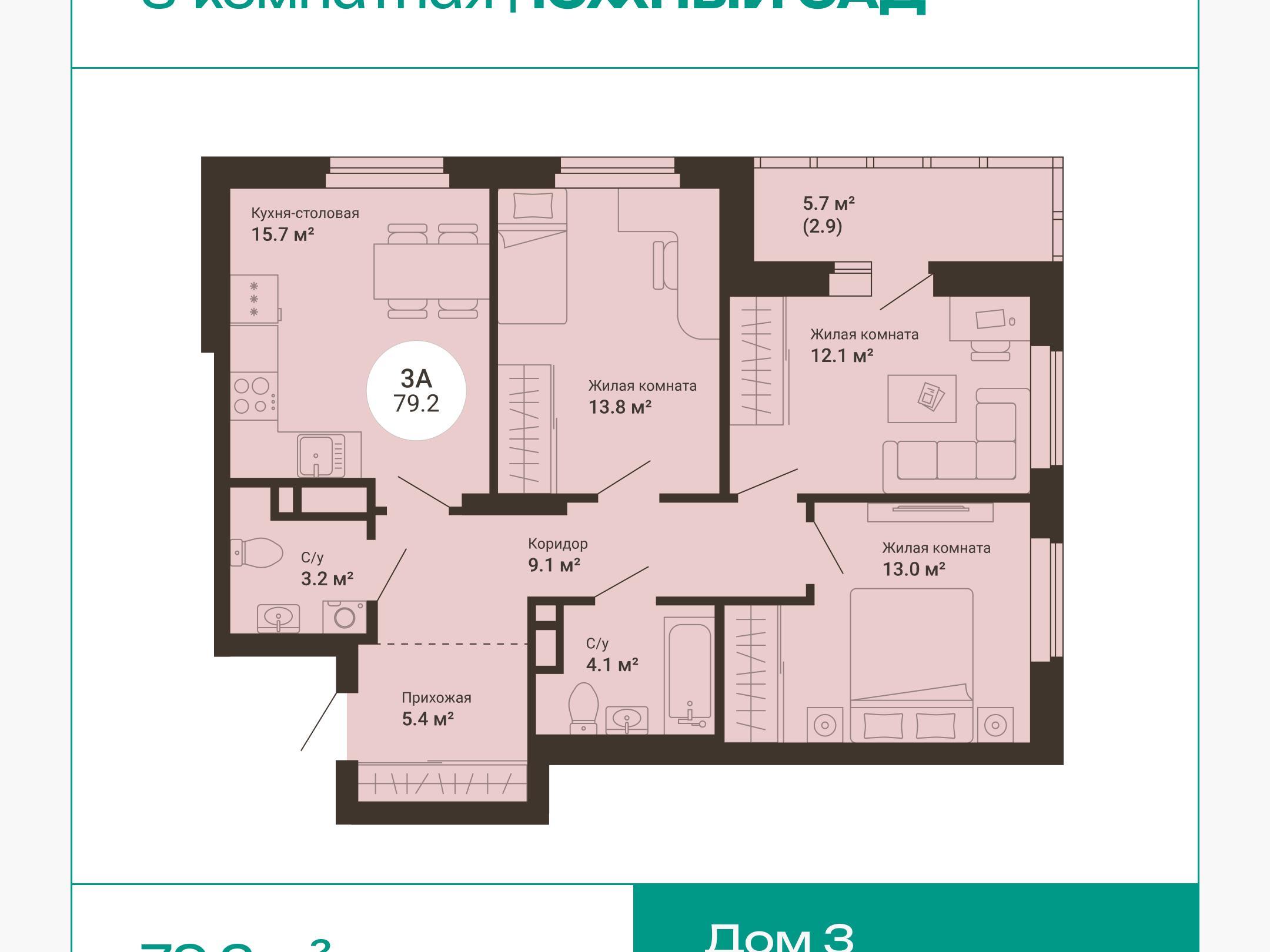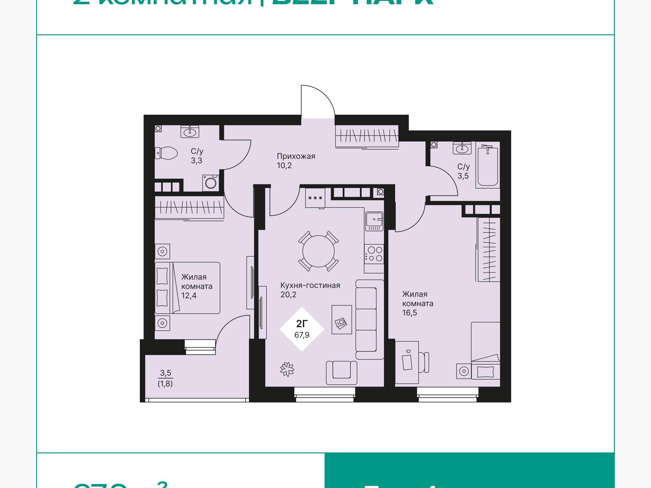 Maximum utility in every meter. Layouts are thought out to the smallest detail so that every room is functional and convenient: isolated bedrooms, kitchen-living rooms as spaces for family evenings, niches for storage systems, two full bathrooms.