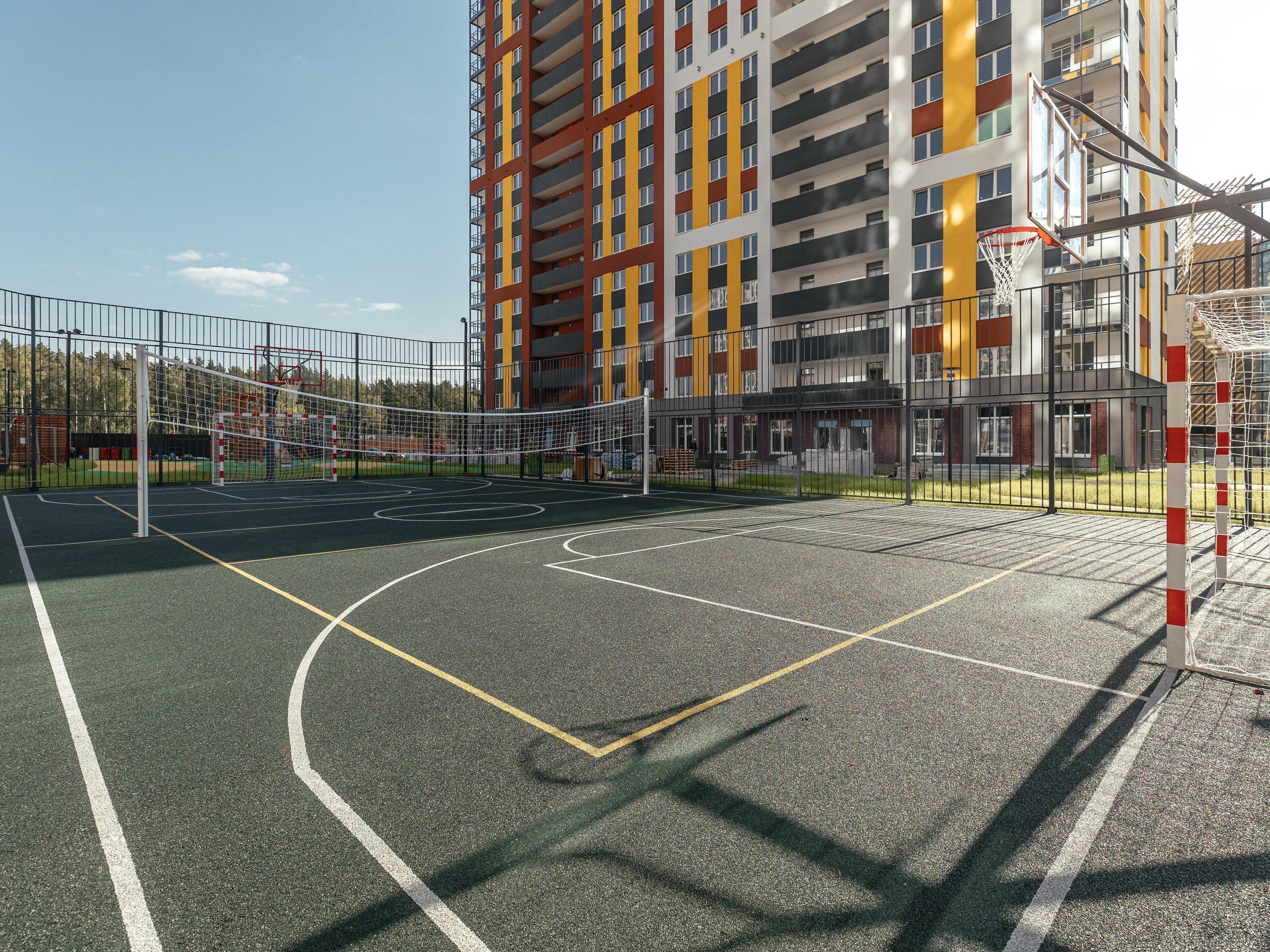 The multifunctional court can be used for football, volleyball, badminton, basketball, or streetball.