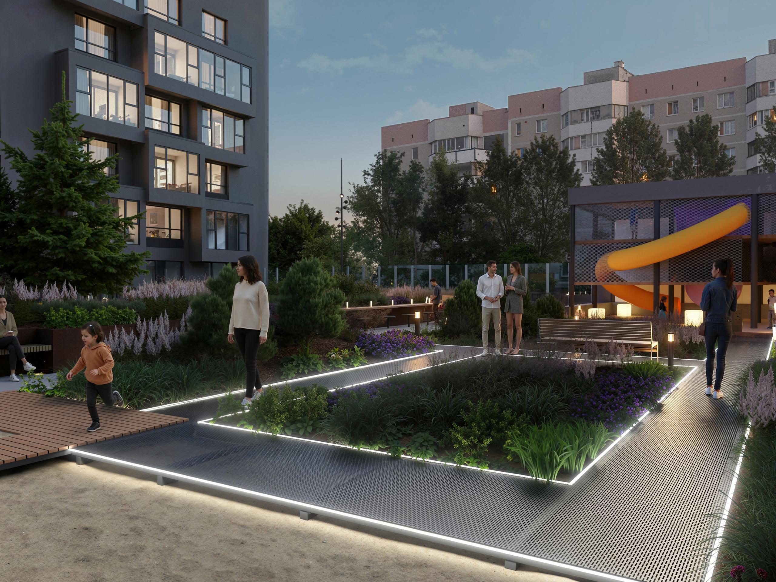 The courtyard will become a true place of strength for residents. Its territory is united by a circular route, along which the main functional zones will be located.