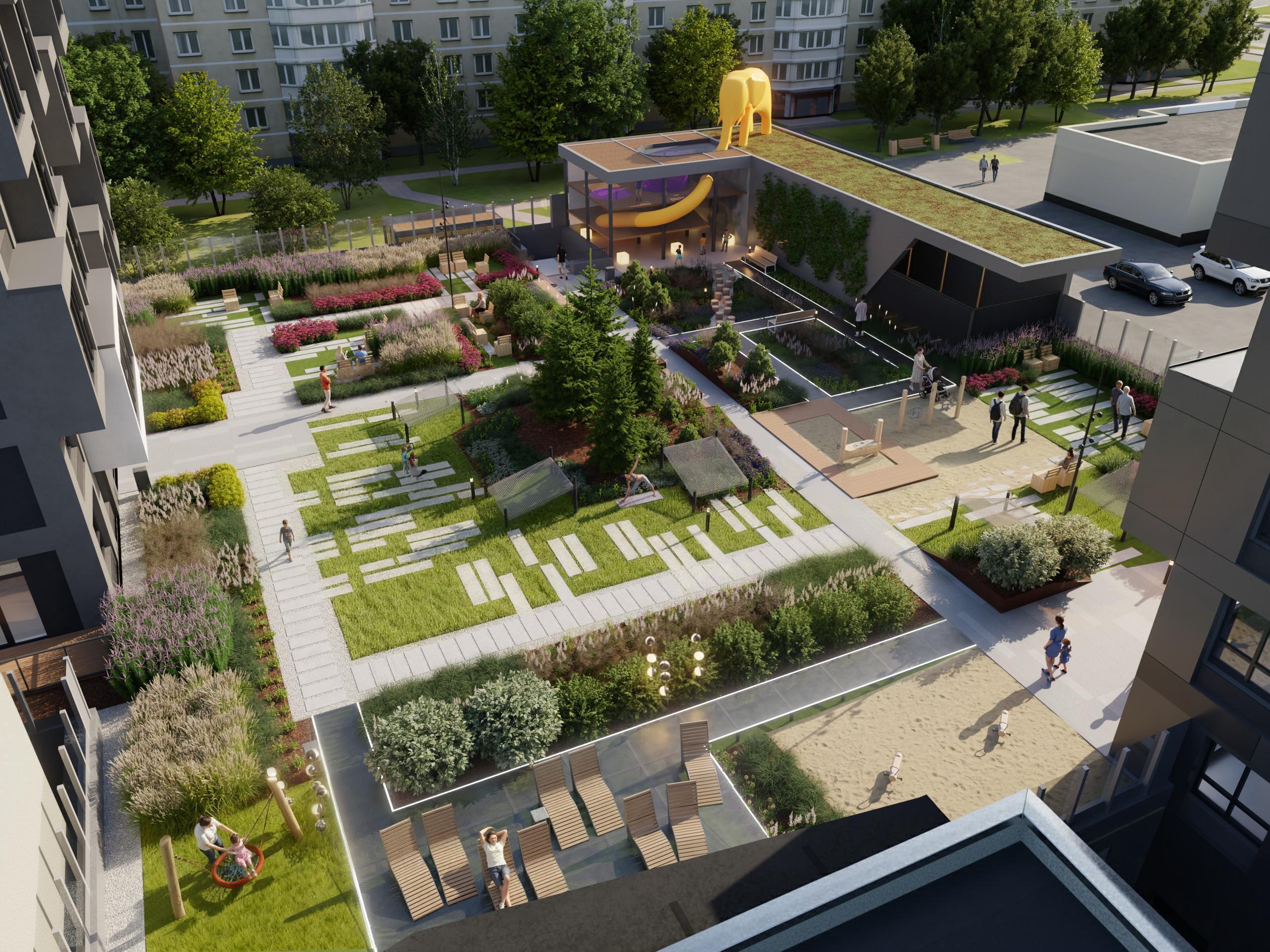 For the youngest residents of the complex, a separate, maximally safe zone with a classic sandbox and a couple of low swings is provided. For older children, the impressive art object «Mammoth» is intended — a multi-level play complex under a pergola canopy with a trunk-slide and a climbing wall.