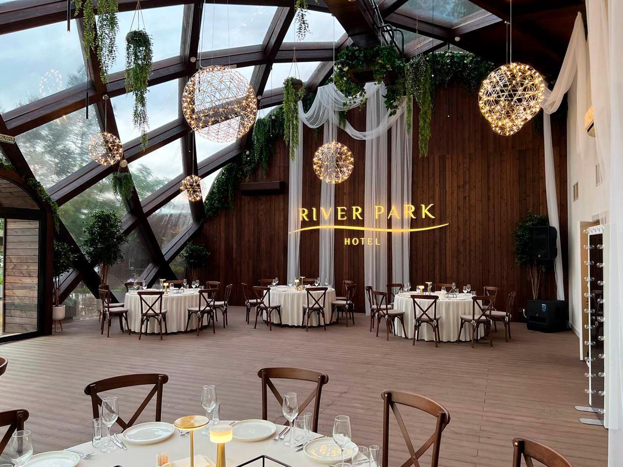 On Mikhailovskaya Embankment, in the picturesque park area of the River Park hotel, there is a spacious banquet hall under a panoramic dome—the perfect place for your dream wedding. They create truly atmospheric celebrations, far from the format of a regular restaurant, yet still within the city limits.